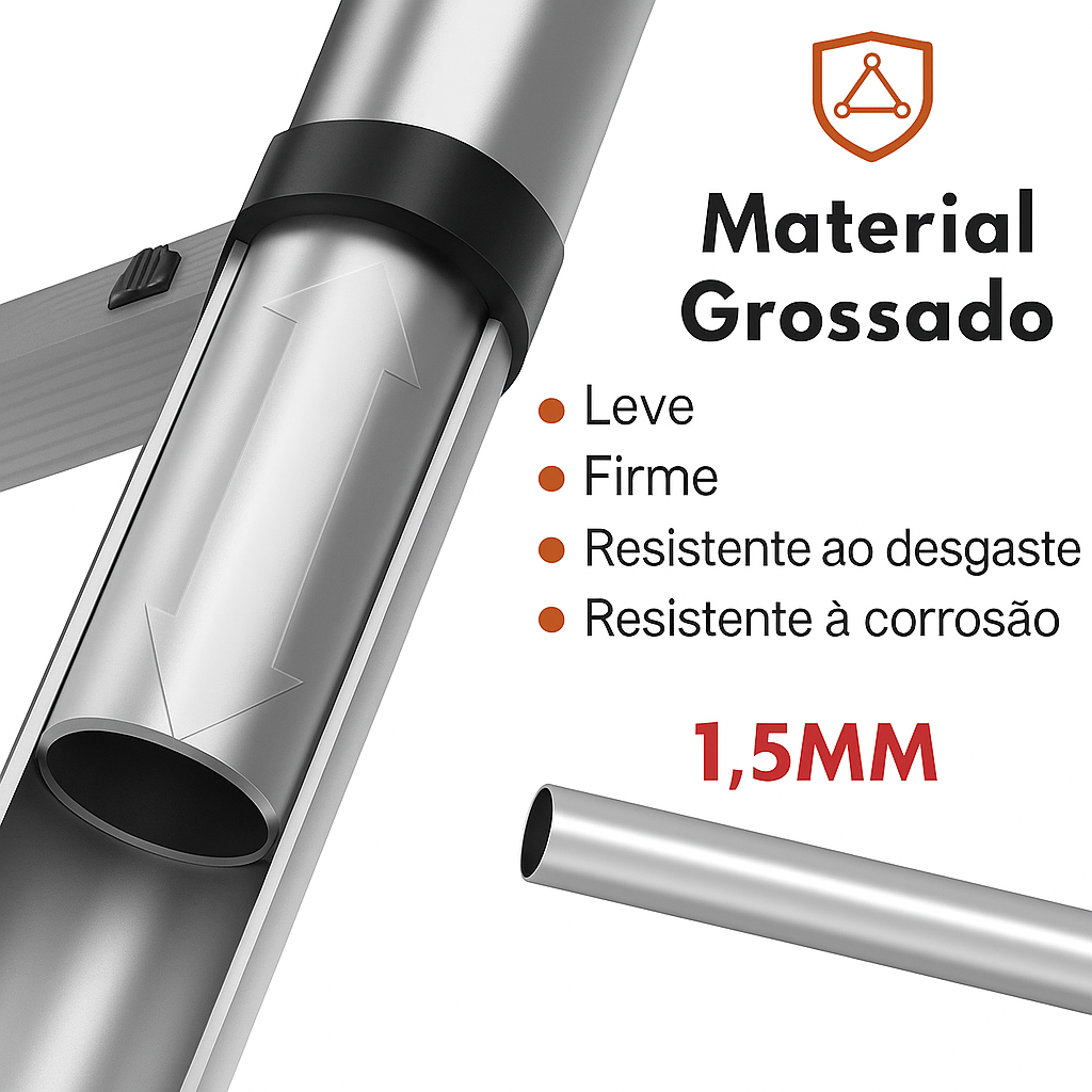 Compacta e prática, a escada telescópica é ideal para quem precisa de alcance sem perder mobilidade. Fechada, ela fica com cerca de 95 cm, cabendo facilmente no porta-malas e facilitando o transporte. Produzida em alumínio, não enferruja e oferece excelente durabilidade no dia a dia.